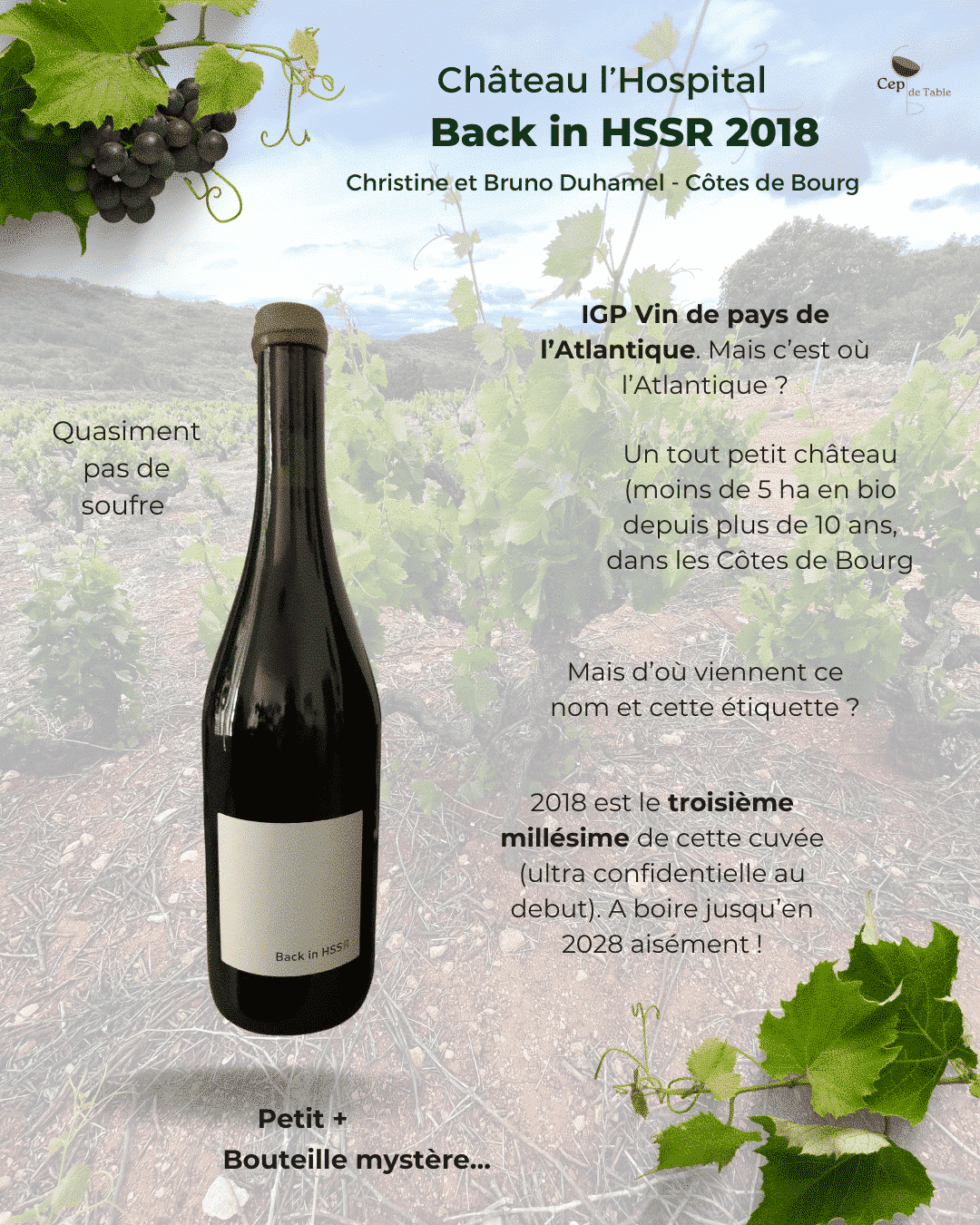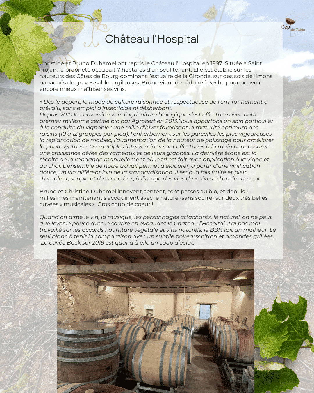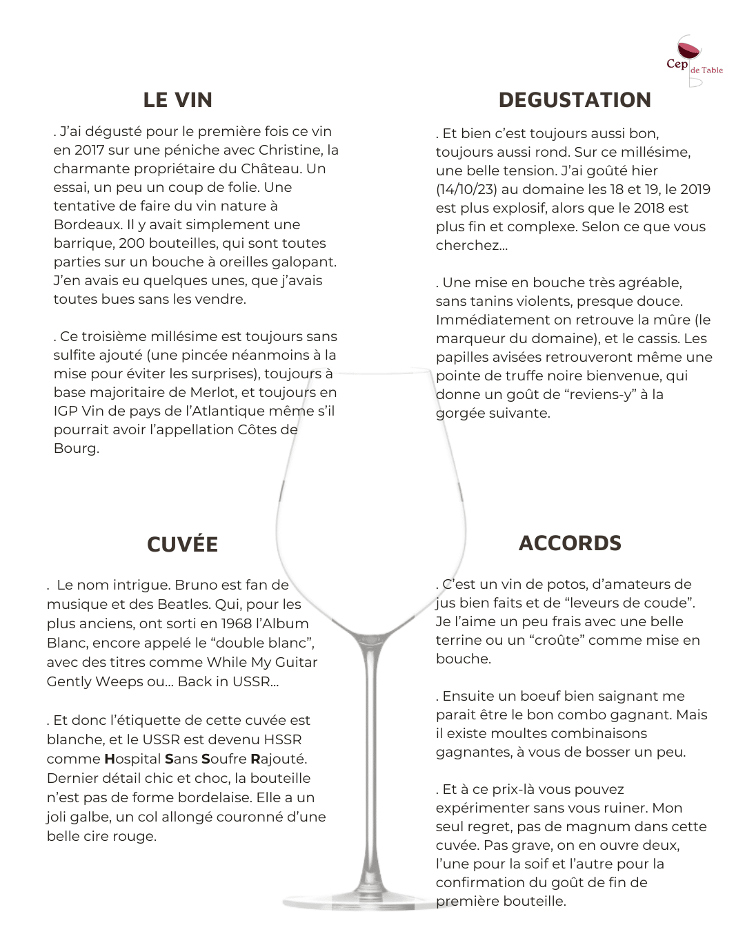 J’ai dégusté pour le première fois ce vin en 2017 sur une péniche avec Christine, la charmante propriétaire du Château. Un essai, un peu un coup de folie. Une tentative de faire du vin nature à Bordeaux. Il y avait simplement une barrique, 200 bouteilles, qui sont toutes parties sur un bouche à oreilles galopant. J’en avais eu quelques unes, que j’avais toutes bues sans les vendre/