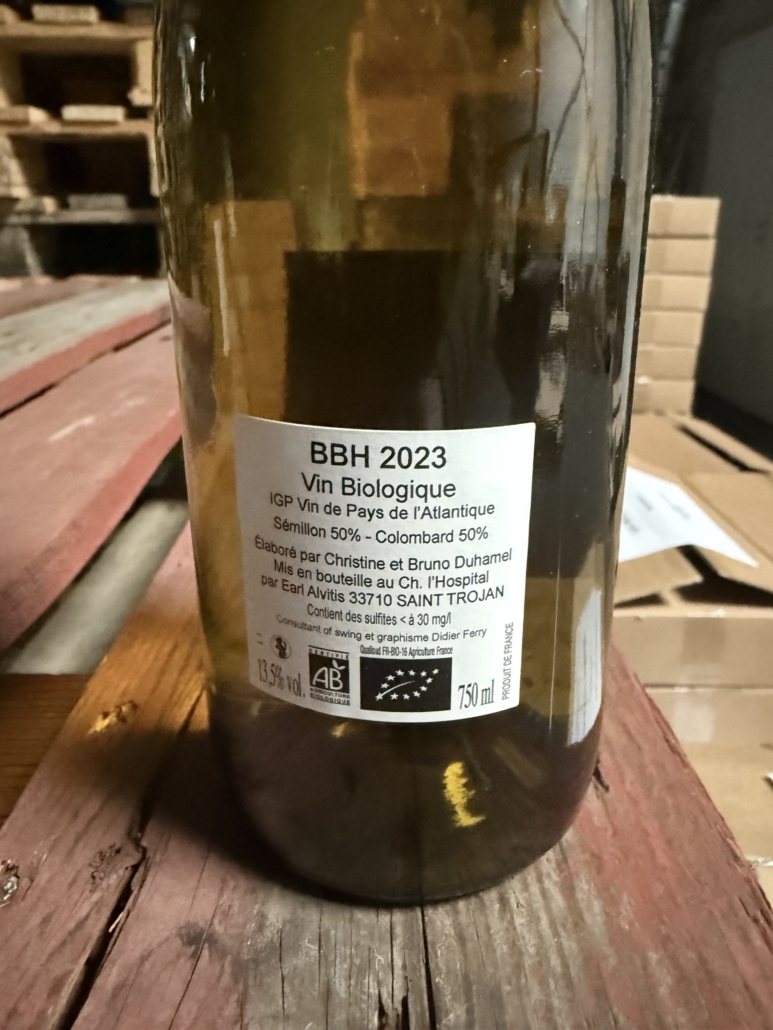 L’encépagement est original, puis qu’à base de Colombard (50%) de Sémillon (50%). On retrouve souvent ce dernier vinifié en moelleux dans les grands Sauternes (dont Yquem à 80%). Les vins issus de Sémillon sont très aromatiques, crémeux et aptes à une longue garde. Le Colombard lui provient du croisement entre le chenin et le gouais. C’est l’un des cépages les plus anciens des Charentes, et il offre principalement des notes d’agrumes, de fruits de la passion, de mangue, d’ananas et de fleurs.