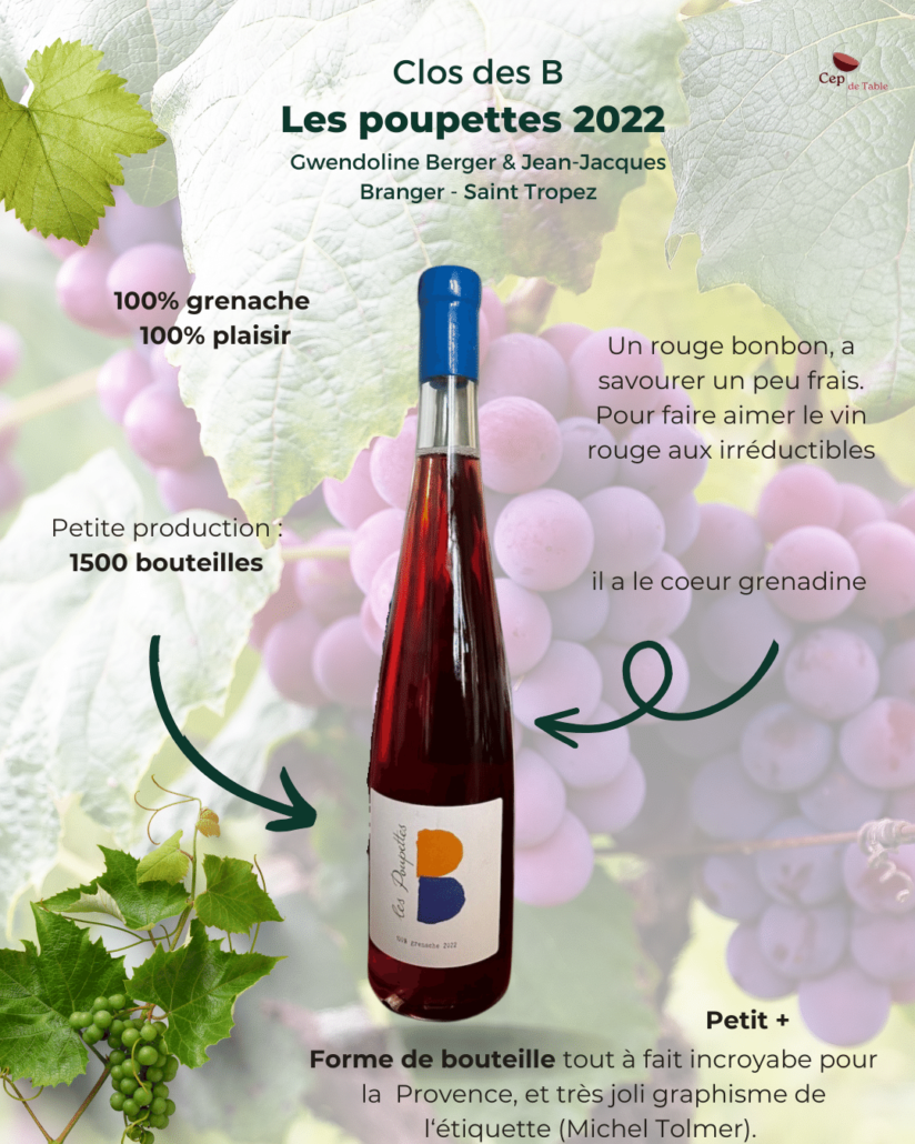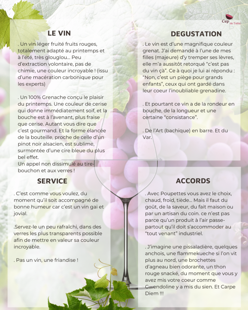« Pour notre première vinification il y a trois ans, nous avions souhaité faire une première cuvée de rouge en 100% Grenache, vinifié en macération carbonique. Notre volonté avait été de faire un vin sur le fruit, plein de fraicheur, avec une belle minéralité et d’une grande buvabilité. Cette cuvée comptait seulement 700 bouteilles et 100 magnums. Cette année à nouveau nous avons réalisé deux cuvées en primeurs. Pour notre deuxième vinification, « Les Poupettes » sont toujours là vu le succès rencontré… »