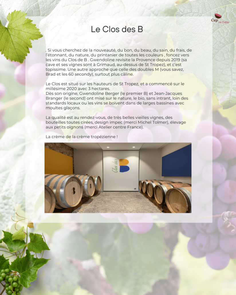 A l’origine du Clos des B il y a la passion. Celle de Gwendolyn qui a grandi autour du Golfe de Saint-Tropez. Elle est une terrienne dans l’âme. Etre au contact de la nature et du vivant a toujours été un vrai besoin pour elle. Et faire du vin est un rêve d’enfance qui ne l’a jamais quittée !