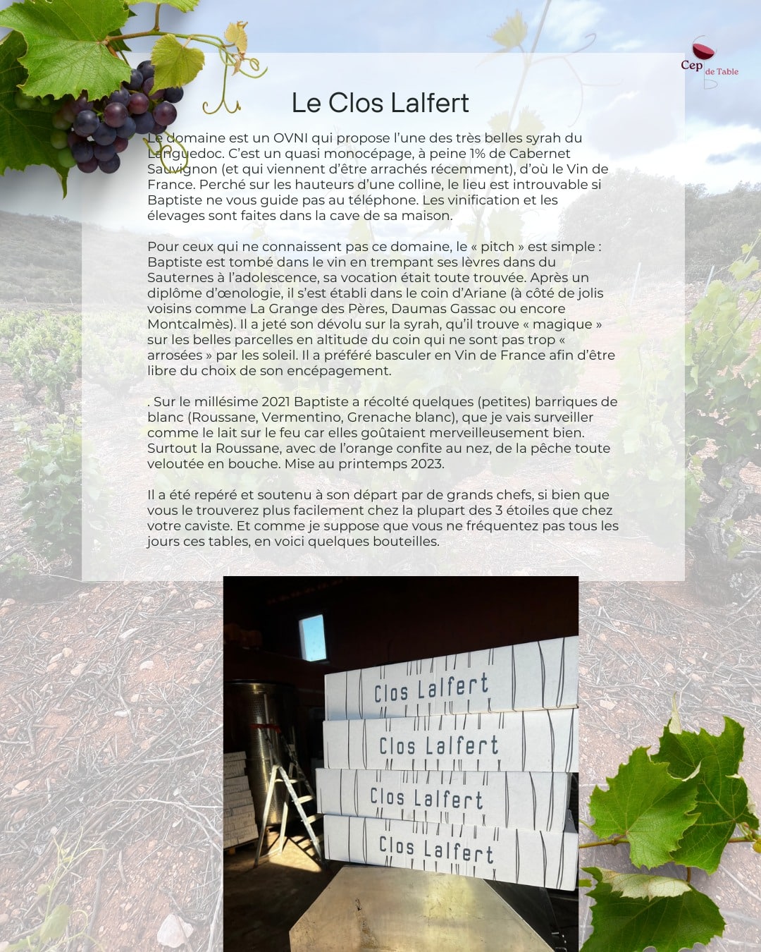 « Sur le millésime 2022 Baptiste a récolté quelques (petites) barriques de blanc (Roussanne – 55% en 2022, Vermentino, Grenache blanc), que je vais surveiller comme le lait sur le feu car elles goûtaient merveilleusement bien. Surtout la Roussane, avec de l’orange confite au nez, de la pêche toute veloutée en bouche. Mise au printemps 2024. »