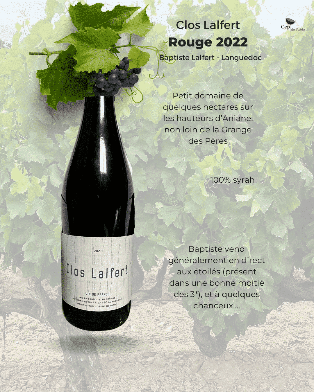 Le Clos Lalfert se rapproche plus de l’aromatique d’une belle syrah de la vallée du Rhône (St Joseph ou Crozes), que d’un « Larzac » (même si j’aime beaucoup les Terrasses). Un joli fruit noir confit se développe rapidement dans le verre, en bouche comme au nez.