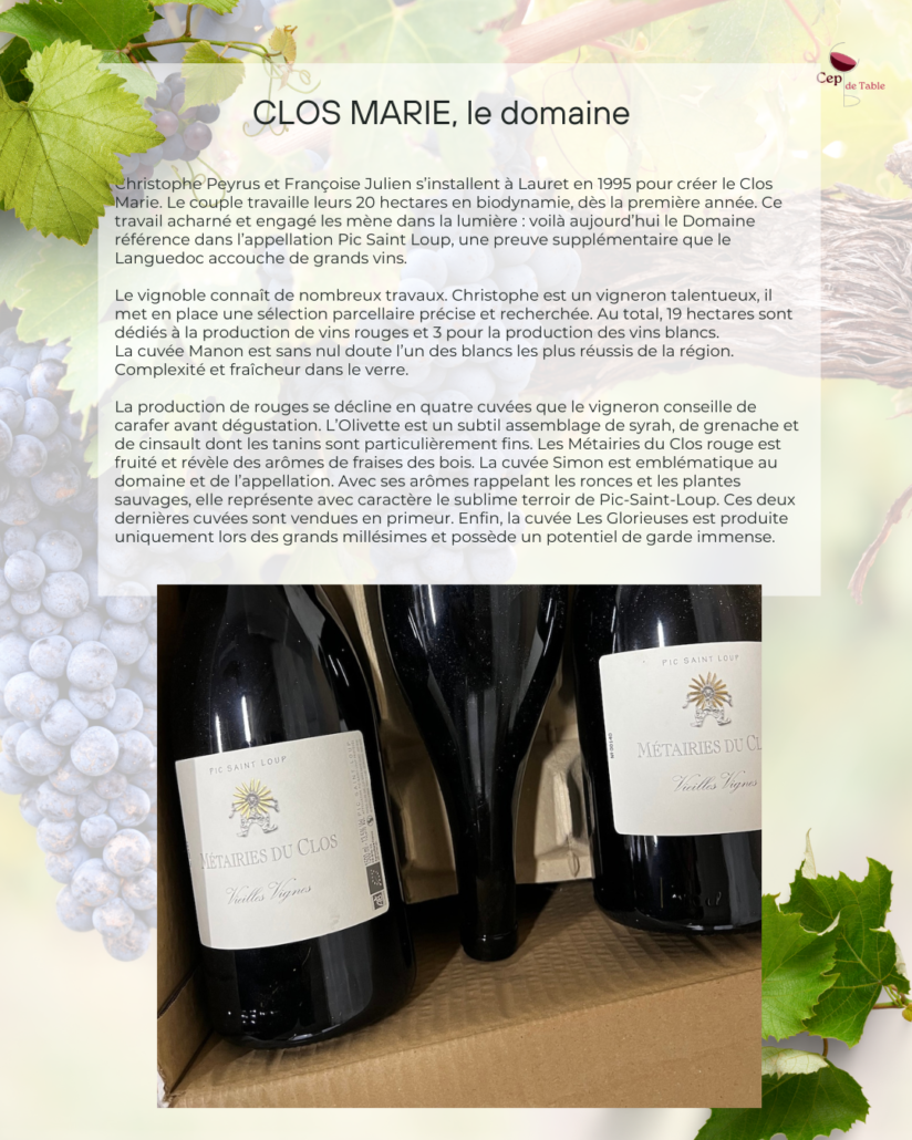 Le Clos Marie est l’un des domaines les plus réputé du Landuedoc, qui a construit la réputation de Pic St Loup.  Les Glorieuses est la micro-cuvée « de garage » comme on dirait à Bordeaux. Elle n’est produite que dans les millésimes qui le méritent. C’est aussi et surtout une démonstration qu’il est possible de réaliser un très grand cru d’appellation Pic Saint-Loup !