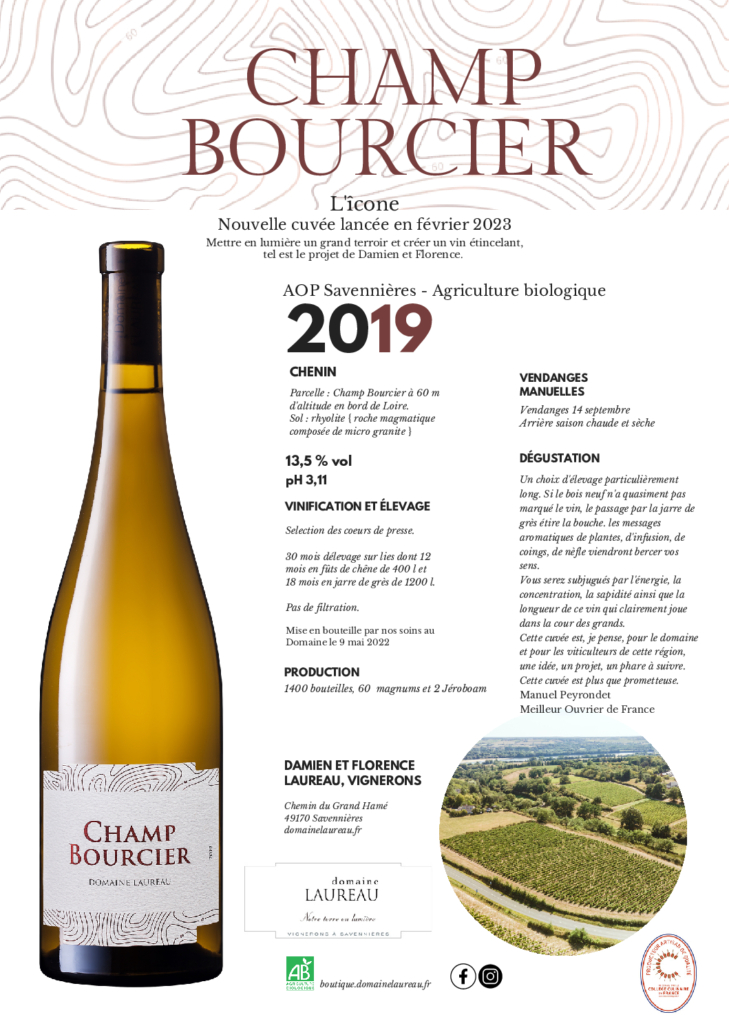 Le 6 février 2023, le domaine lançait sa nouvelle cuvée de Savennières : « Champ Bourcier ». La récolte de 2019 sur la parcelle de rhyolite (roche volcanique qui s’est refroidie en surface et très riche en silice) a donné le signal pour réaliser cette cuvée « icône ». Damien y pensait depuis longtemps déjà.