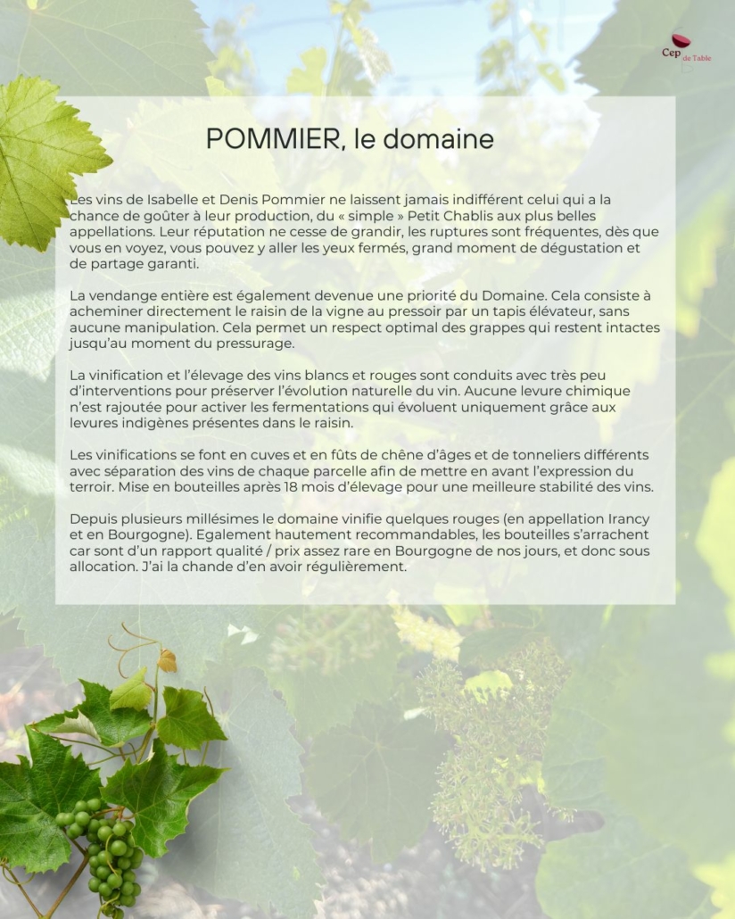 Cette cuvée a été élaborée à partir de vignes de 30 à 70 ans d’âge, toutes implantées sur la Côte de Troesmes. Les vendanges ont été exclusivement réalisées à la main et les grappes recueillies acheminées directement au pressoir afin de garantir un respect optimal du raisin.