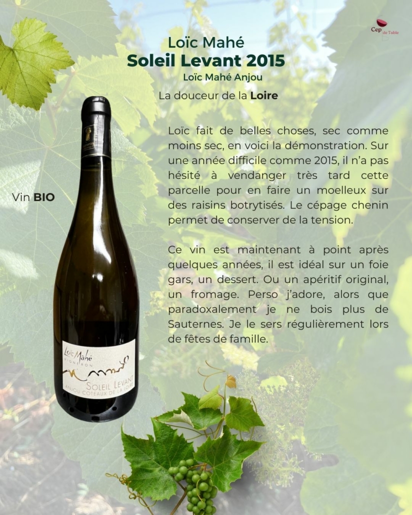 Loïc fait de belles choses, sec comme moins sec, en voici la démonstration. Sur une année difficile comme 2015, il n’a pas hésité à vendanger très tard cette parcelle pour en faire un moelleux sur des raisins botrytisés. Le cépage chenin permet de conserver de la tension. Parfaitement à point, il vous accompagnera encore de longues années.