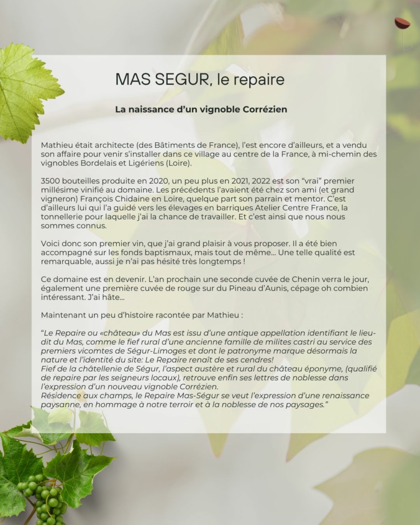 Mathieu Puel, architecte de son état, a été judicieusement aidé les premières années par François Chidaine en Loire, et devient l’un des vignerons à suivre dans une région peu connue des amateurs de vin, la Corrèze.