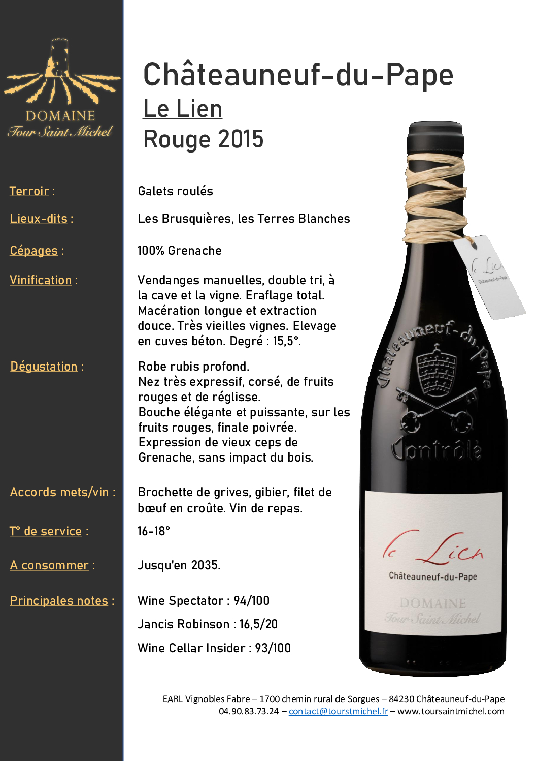 Les plus vieilles vignes de grenache du domaine, à l’époque élevées en cuve béton, sans barrique aucune aucune afin de préserver le fruit original. Un vin de repas au nez très expressif, corsé, de fruits rouges et de réglisse. La bouche est élégante, puissante et surtout équilibrée, avec une belle finale finale poivrée.